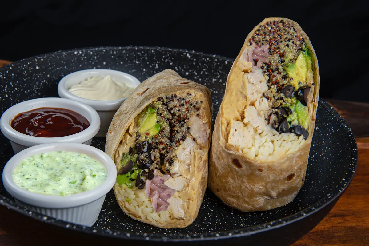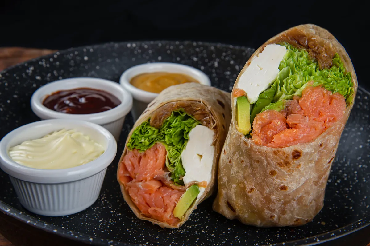 Wrap de Láminas de Salmon ahumado, lechuga hidropónica, queso crema, cebolla caramelizada, palta y 2 salsas a elección